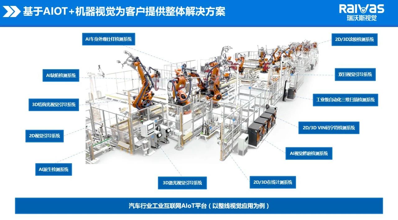 洪沛駿以汽車(chē)行業(yè)為例,展示了瑞沃斯視覺(jué)在汽車(chē)行業(yè)AIoT+機(jī)器視覺(jué)解決方案整體架構(gòu)和AIoT平臺(tái)應(yīng)用場(chǎng)景,進(jìn)一步介紹瑞沃斯視覺(jué)自主研發(fā)應(yīng)用于汽車(chē)智能制造的AI視覺(jué)修磨檢測(cè)系統(tǒng)、AI車(chē)身外觀(guān)仕樣檢測(cè)系統(tǒng)、AI字符檢測(cè)系統(tǒng)等多款產(chǎn)品。